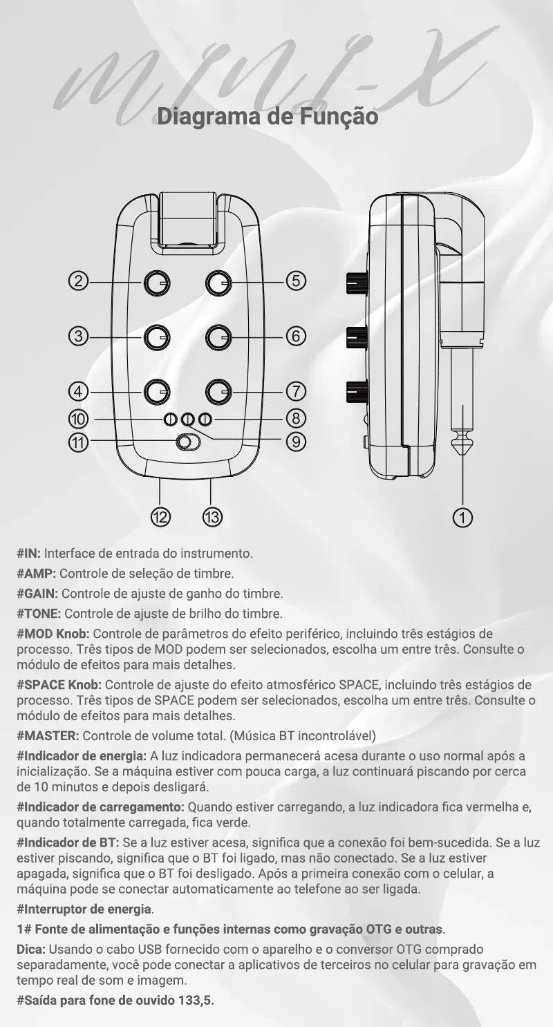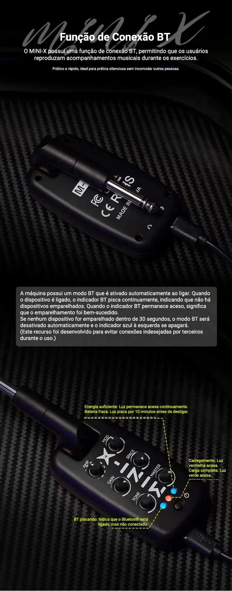 Reverberação, Delay, reverb + atraso, três efeitos de atmosfera para escolher.O M|N|-X can be conectado ao BT para tocar acompanhamento para praticar, sem incomodar ninguém.