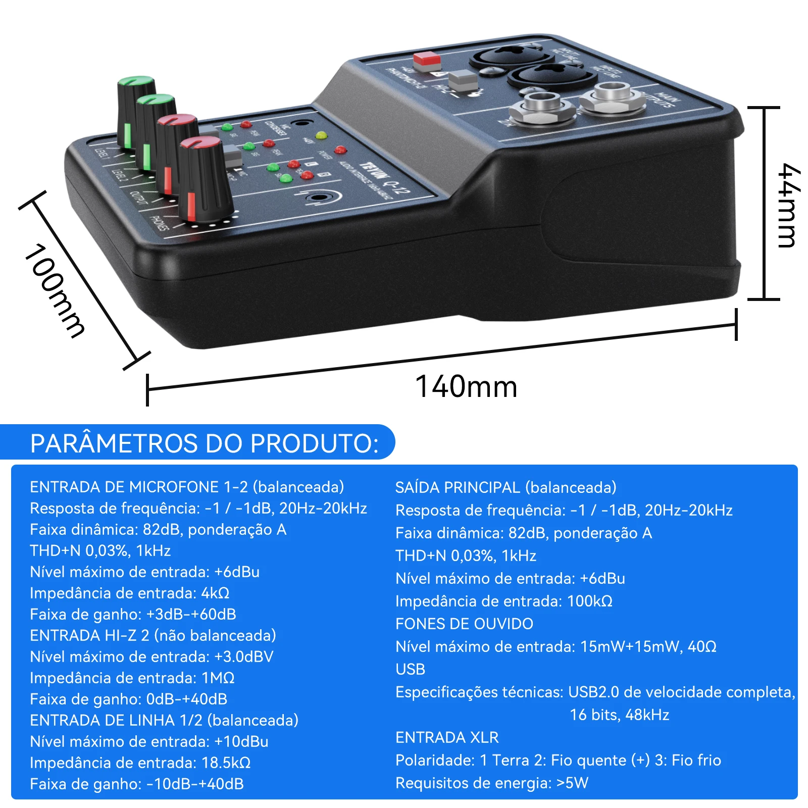Técnicas de especificações: USB2.0 de velocidade total, 16 bits, 48 kHz