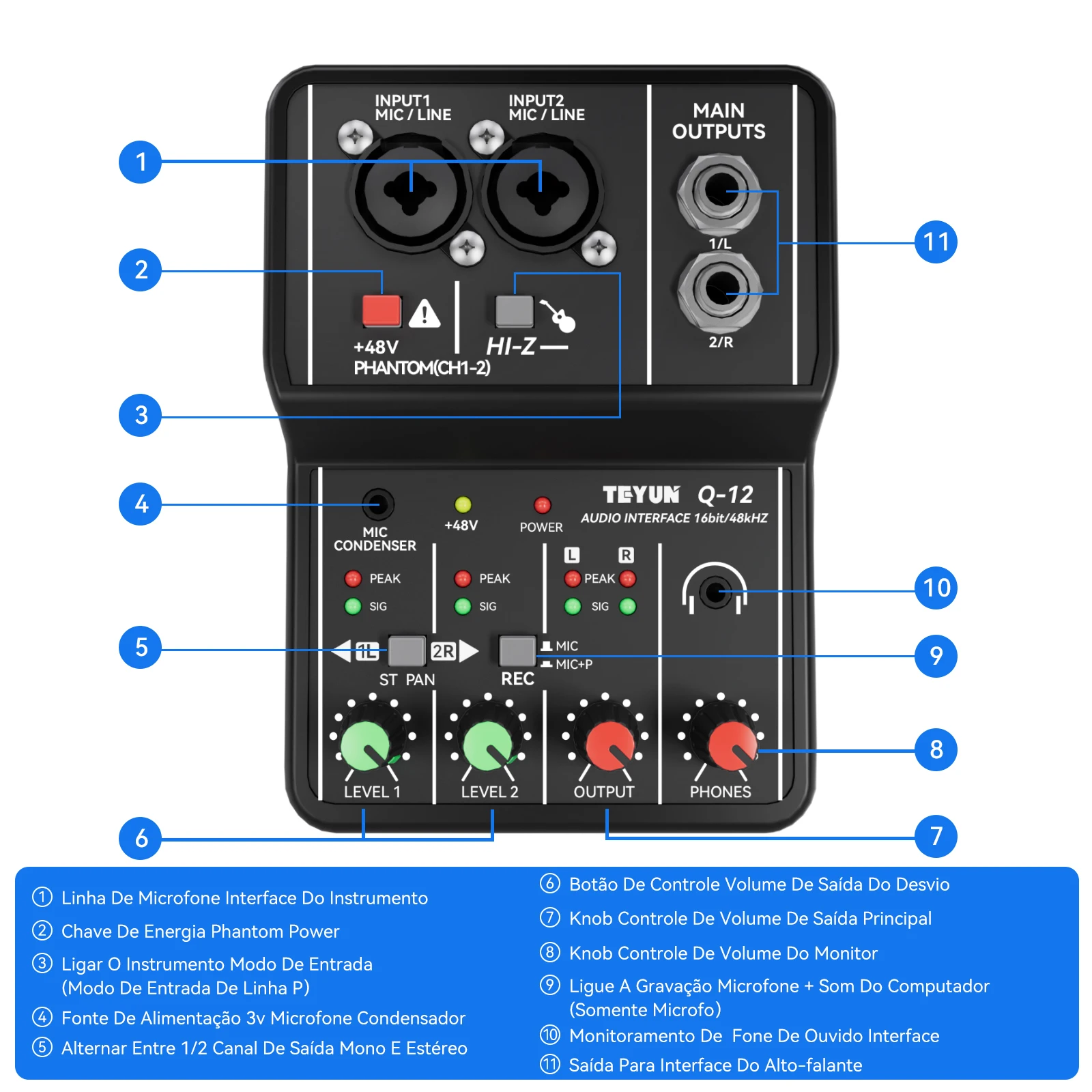 Interface de Áudio Placa de Som com 2 Canais - Teyun Q-12