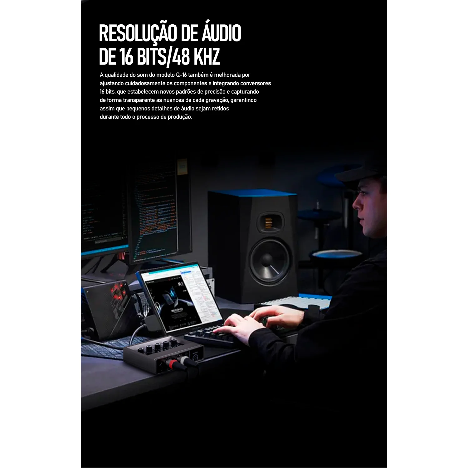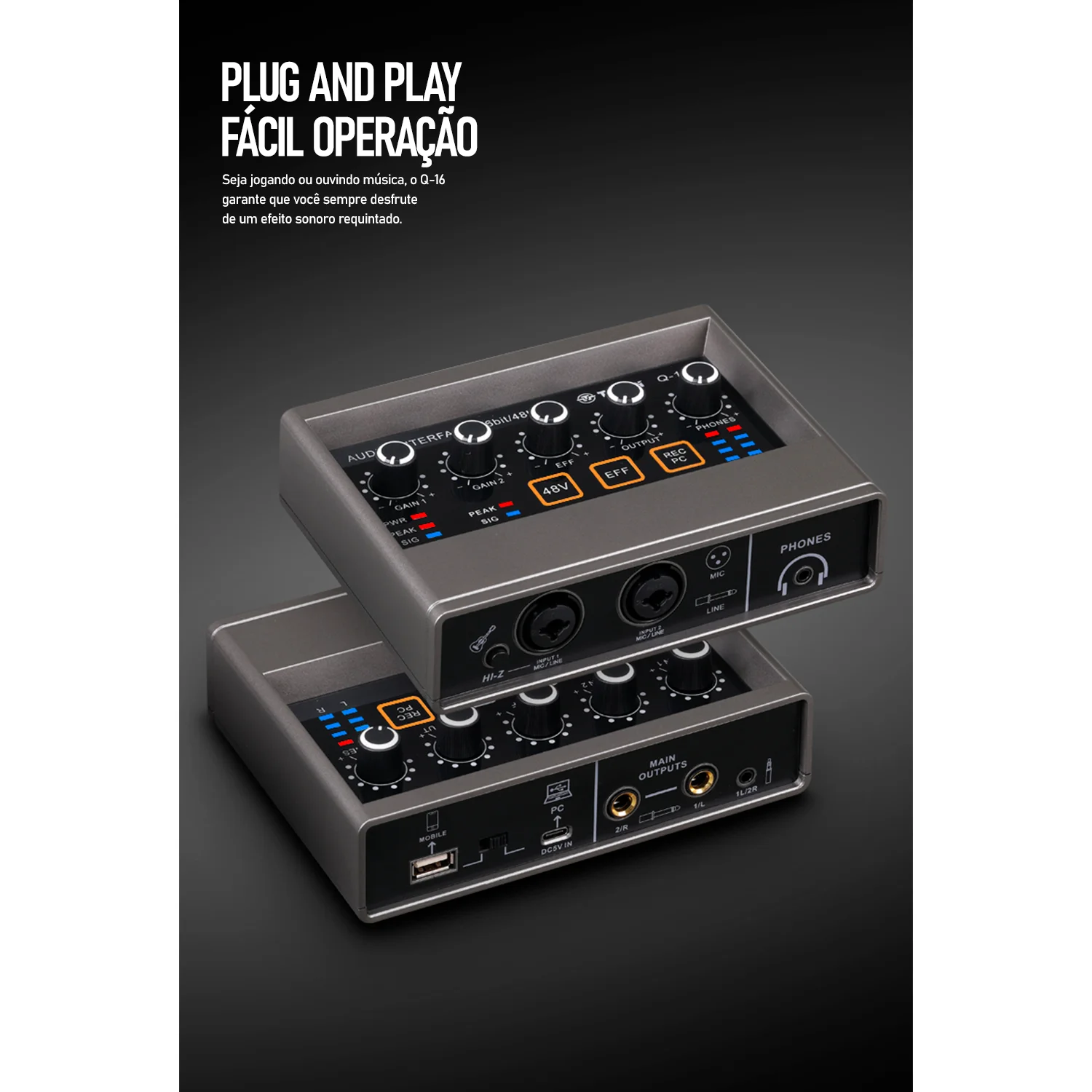 A placa de som Q-16 possui tecnologia e compatibilidade mais poderosas, com interface de alta speecUSB2.0, processador digital de alta velocidade embutido, com distorção extremamente baixa e processamento de sinal digital de alta precisão, o DSP embutido pode ajustar o efeito de reverberação e o interruptor de botão tipo toque.