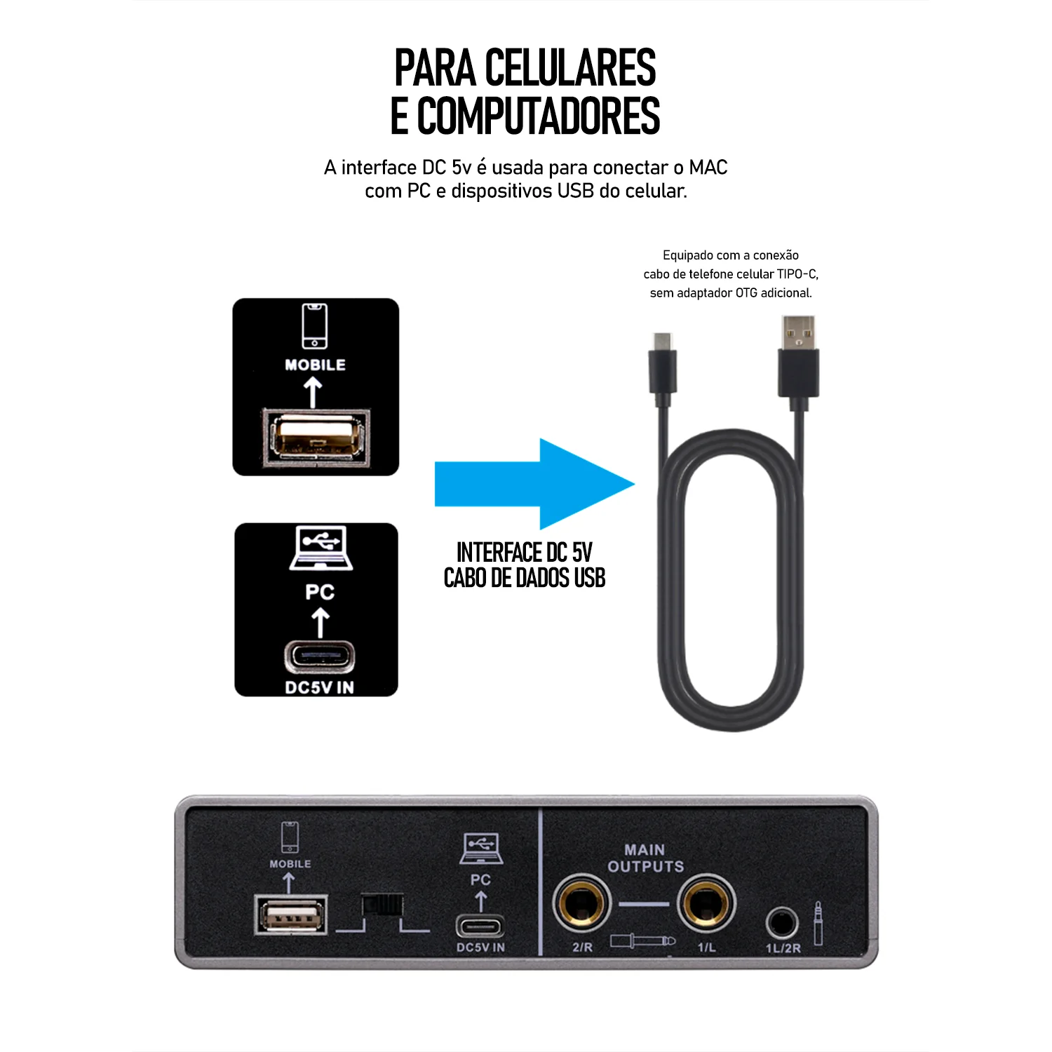Q-16 com conversores AD e DA, taxas de amostragem de até 16 bits/48KHZ, que podem contribuir com qualidade de gravação, resposta dinâmica e rica baixa frequência. A conversão de alta qualidade é a chave para alcançar a conversão de sinal de áudio de alta qualidade. A fonte de alimentação pode ser conectada ao PC/DC 5V IN, fornecendo conexão com computadores MAC e PC.